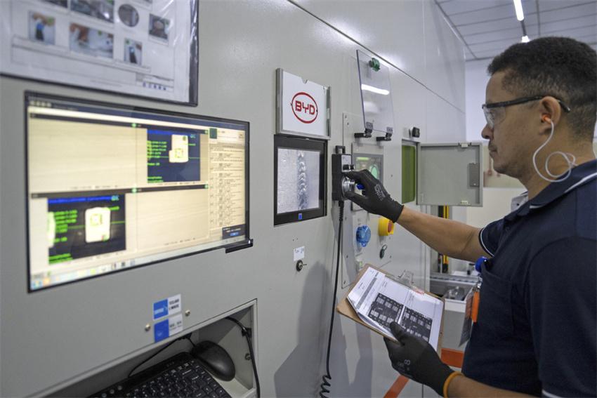 Miembros del personal de BYD trabajan en la línea de producción en la planta de baterías de la compañía ubicada en Manaus, estado de Amazonas, Brasil, 12 de marzo de 2024. [Xinhua]