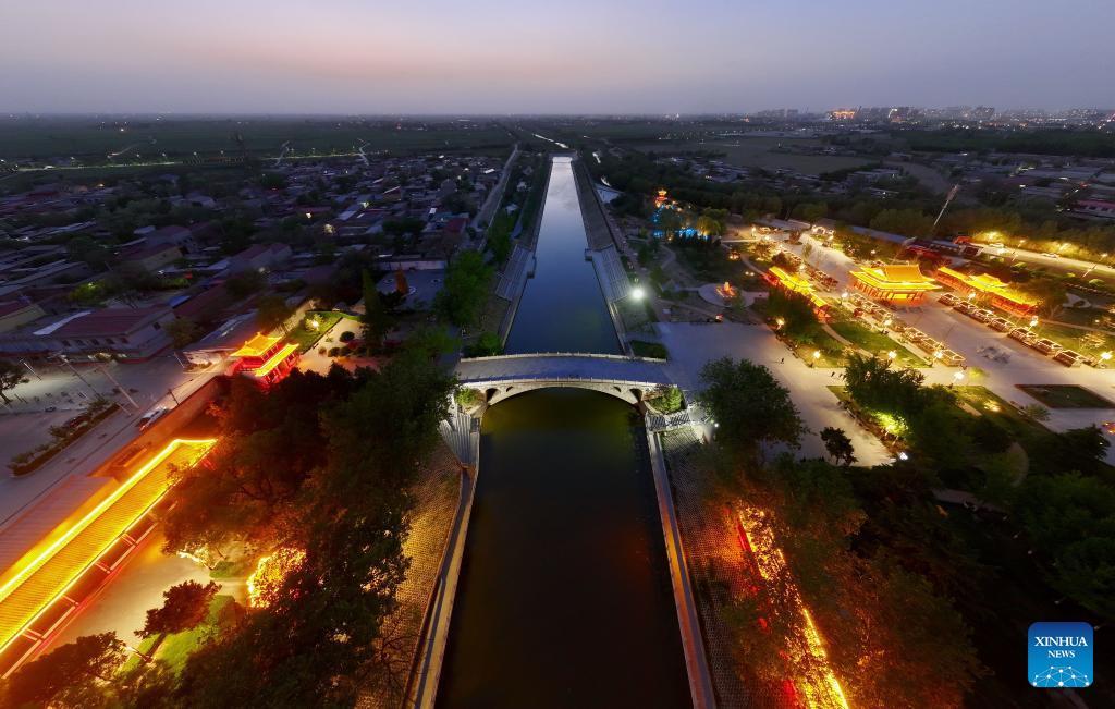 Una foto aérea tomada con un dron el 24 de abril de 2024 muestra el puente Zhaozhou por la noche en el distrito de Zhaoxian, en la provincia de Hebei, en el norte de China. (Xinhua/Mu Yu.)