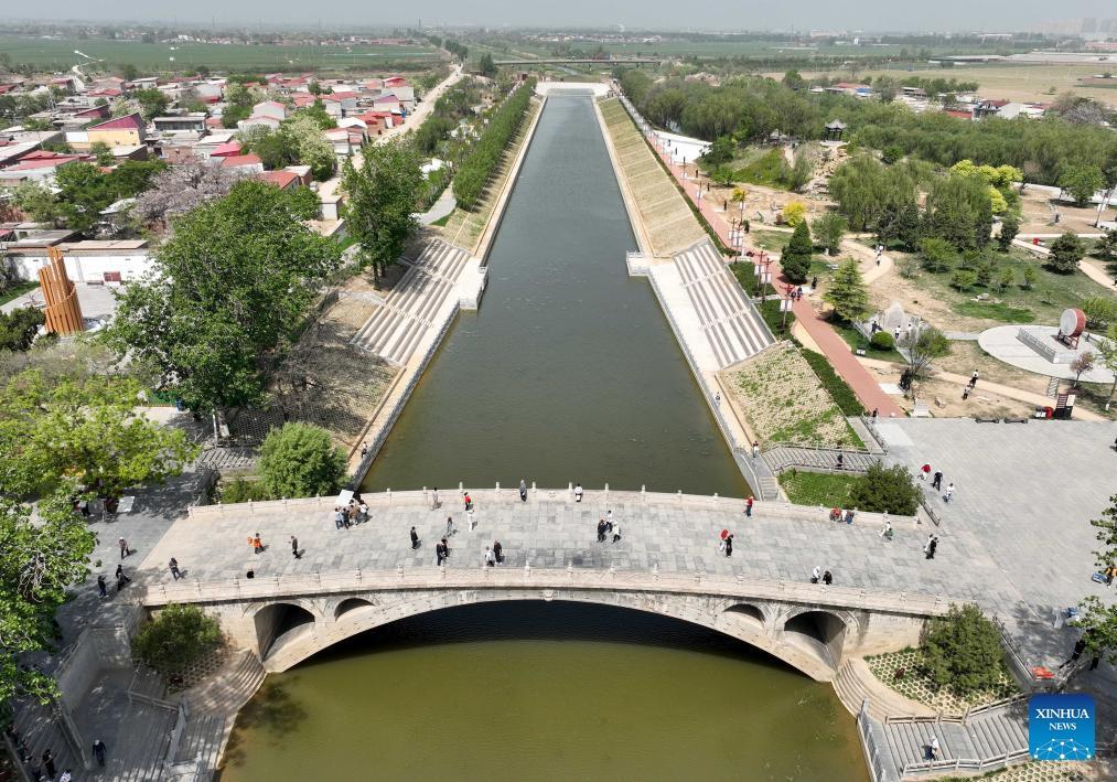 Una foto aérea tomada con un dron el 25 de abril de 2024 muestra el puente Zhaozhou en el distrito de Zhaoxian, en la provincia de Hebei, en el norte de China. (Xinhua/Wang Yuguo.)