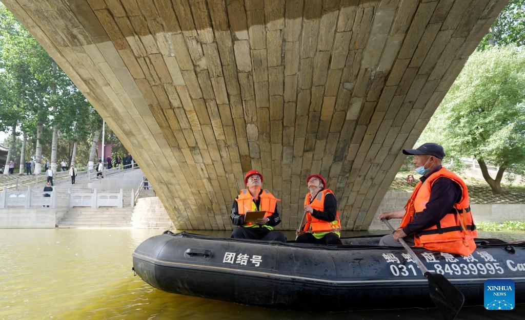 Técnicos de protección de reliquias culturales inspeccionan la parte inferior del puente Zhaozhou en el distrito de Zhaoxian, provincia de Hebei, en el norte de China, el 25 de abril de 2024. (Xinhua/Wang Yuguo.)