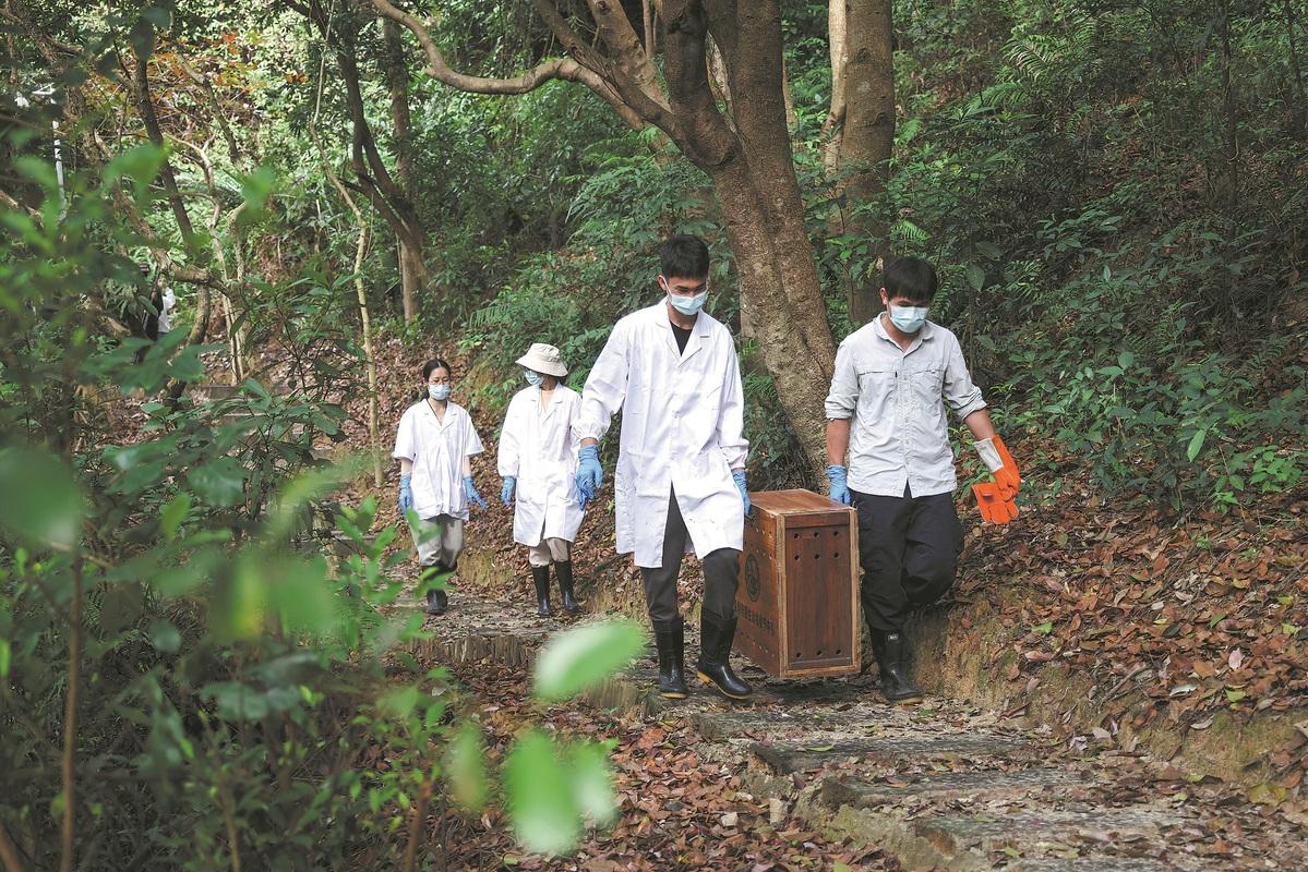 Trabajadores del sector animal llevan al gato leopardo a la montaña Wutong de Shenzhen antes de su liberación. ZHU HONGBO/NANFANG DAILY.