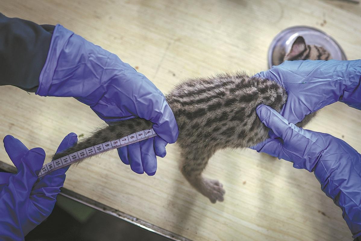 Veterinarias miden la longitud de la cola de un gato leopardo en el Centro de Rescate de Fauna Salvaje de Shenzhen, provincia de Guangdong, el 31 de octubre. ZHU HONGBO/NANFANG DAILY.