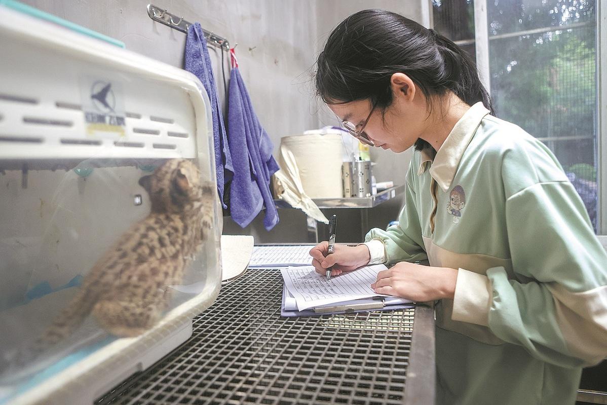 La veterinaria Zheng Suqun comprueba la salud del gato leopardo el 11 de octubre. ZHU HONGBO/NANFANG DAILY.