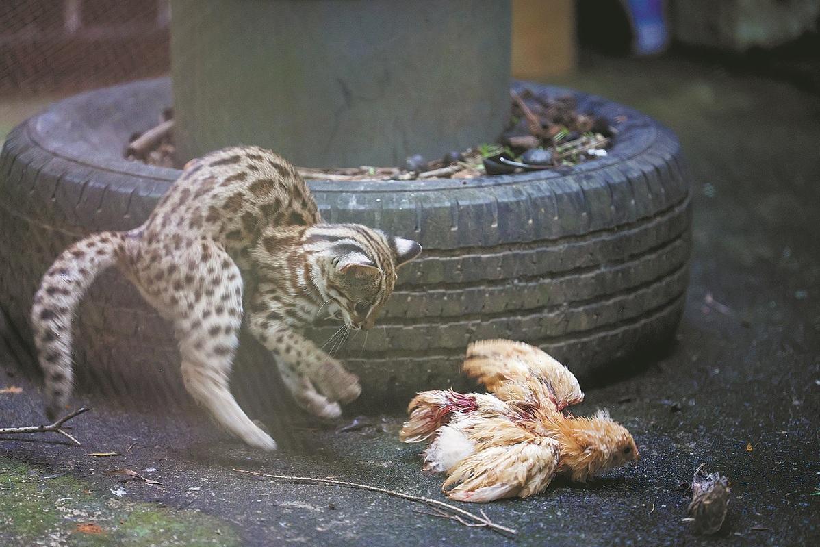 El gato leopardo aprende a cazar una gallina viva el 2 de diciembre. ZHU HONGBO/NANFANG DAILY.