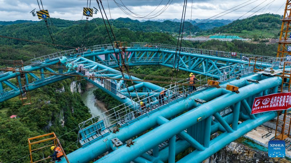 PINGTANG, 10 mayo, 2024 (Xinhua) -- Imagen tomada con un dron el 10 de mayo de 2024 del sitio de construcción del puente del río Lami a lo largo de la autopista Guiyang-Pingtang, en la provincia de Guizhou, en el suroeste de China. El puente, con una longitud total de 206 metros, vio cerradas sus costillas de arco el viernes. (Xinhua/Tao Liang)