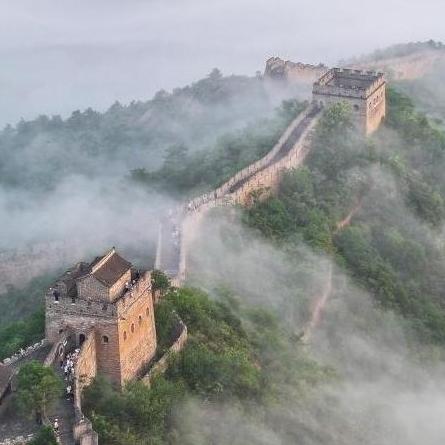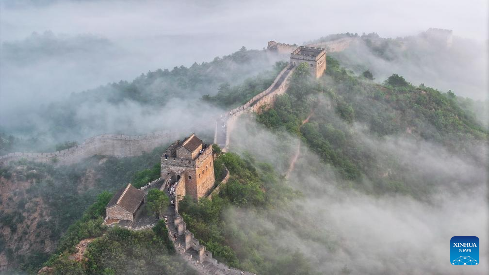 Vista aérea tomada con un dron el 30 de junio de 2024 de la sección de Jinshanling de la Gran Muralla cubierta por nubes después de la lluvia, en el distrito de Luanping, en la ciudad de Chengde, en la provincia de Hebei, en el norte de China. (Xinhua/Liu Mancang)