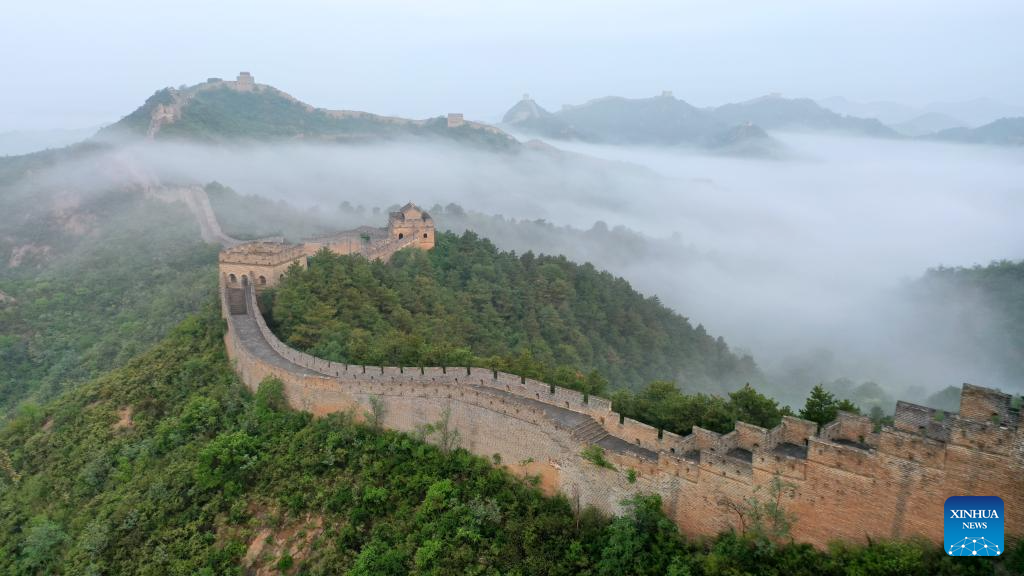 Vista aérea tomada con un dron el 30 de junio de 2024 de la sección de Jinshanling de la Gran Muralla cubierta por nubes después de la lluvia, en el distrito de Luanping, ciudad de Chengde, en la provincia de Hebei, en el norte de China. (Xinhua/Zhou Wanping)