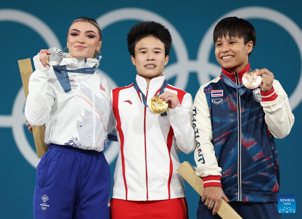 La medallista de oro Hou Zhihui (c) de China, la medallista de plata Mihaela Valentina Cambei (i) de Rumania y Surodchana Khambao de Tailandia muestran sus medallas durante la ceremonia de victoria para la división femenil de 49 kilogramos de halterofilia en los Juegos Olímpicos de París 2024, en París, Francia, el 7 de agosto de 2024. (Xinhua/Yang Lei)