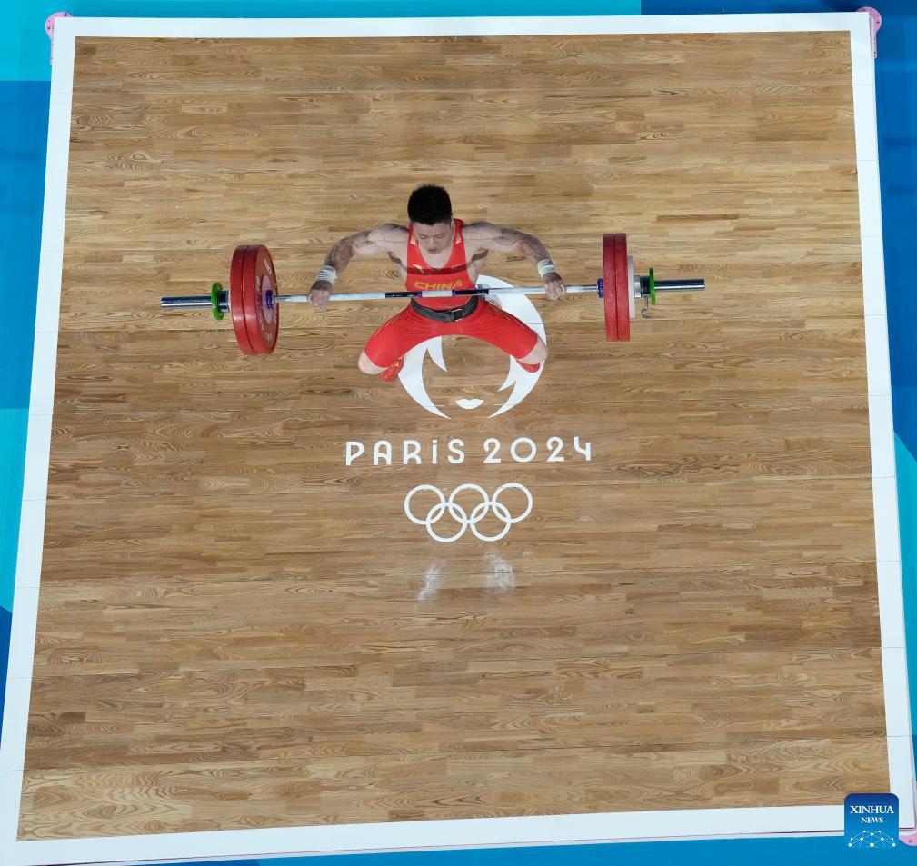 Li Fabin de China compite durante la competición de halterofilia masculina de 61 kilogramos en los Juegos Olímpicos de París 2024, en París, Francia, el 7 de agosto de 024. (Xinhua/Dita Alangkara/POOL)