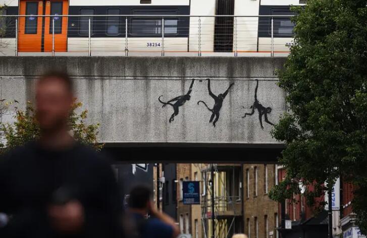 Y el miércoles reveló tres monos que se balancean desde un puente ferroviario en Shoreditch, una de las zonas de moda en el este de capital.