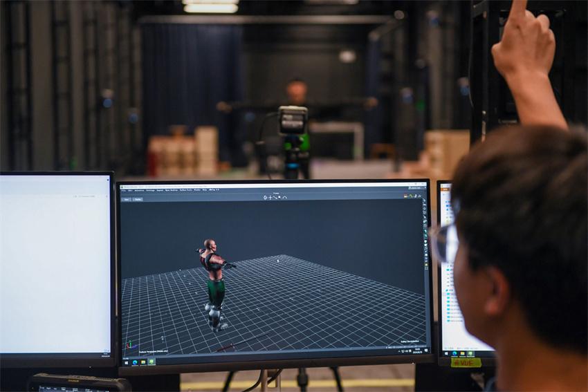 Un miembro del equipo instruye a Yin Kai sobre los movimientos en un taller en Shenzhen, provincia de Guangdong, en el sur de China, 28 de agosto de 2024. Considerado el primer videojuego independiente chino de alto coste, volumen y calidad, “Black Myth: Wukong” apuesta por el uso de la tecnología más avanzada en captura de movimientos a fin de incorporar las artes marciales del mundo real. [Xinhua]