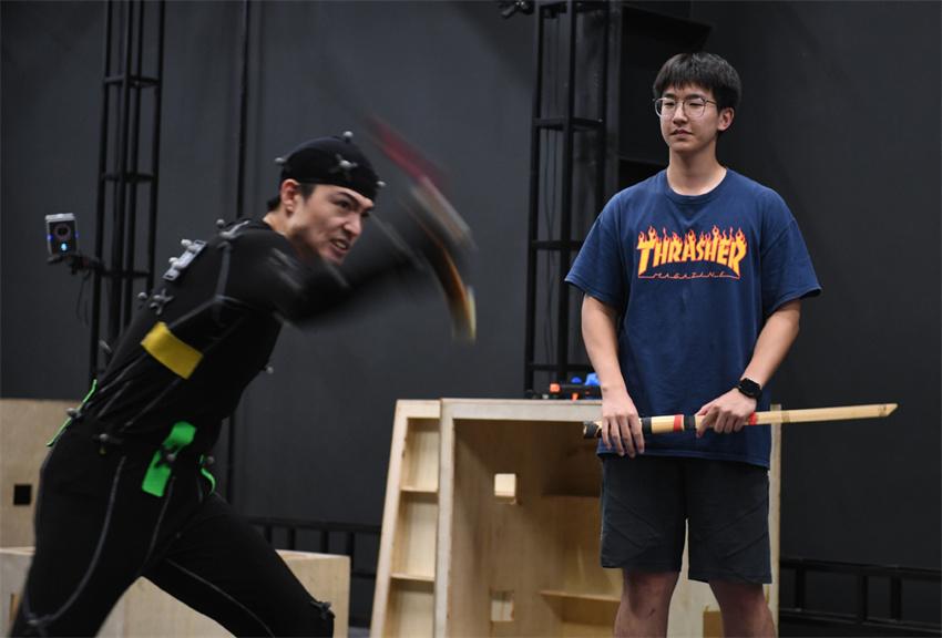Yin Kai (izquierda) trabaja bajo la instrucción de un miembro del equipo de captura de movimiento en un taller en Shenzhen, provincia de Guangdong, sur de China, 28 de agosto de 2024. Considerado el primer videojuego independiente chino de alto coste, volumen y calidad, “Black Myth: Wukong” apuesta por el uso de la tecnología más avanzada en captura de movimientos a fin de incorporar las artes marciales del mundo real. [Xinhua]