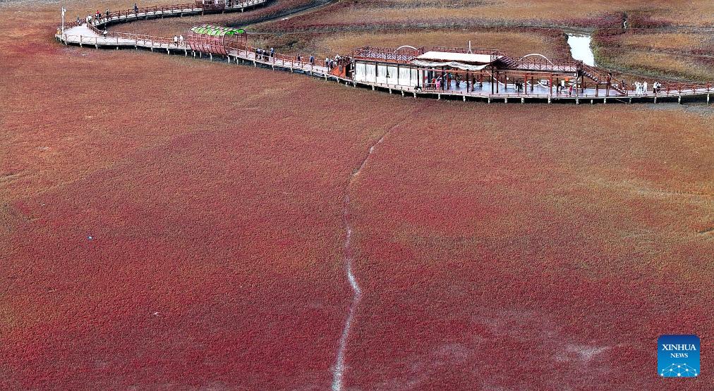 La Playa Roja es famosa por sus paisajes mostrando la planta roja Suaeda salsa.