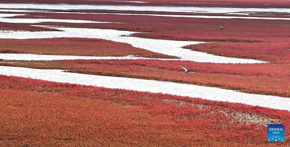 Imagen del 14 de septiembre de 2024 de un pájaro volando sobre el área escénica de la Playa Roja, en Linghai, ciudad de Jinzhou, en la provincia de Liaoning, en el noreste de China. La Playa Roja es famosa por sus paisajes mostrando la planta roja Suaeda salsa. (Xinhua/Zhou Hua)