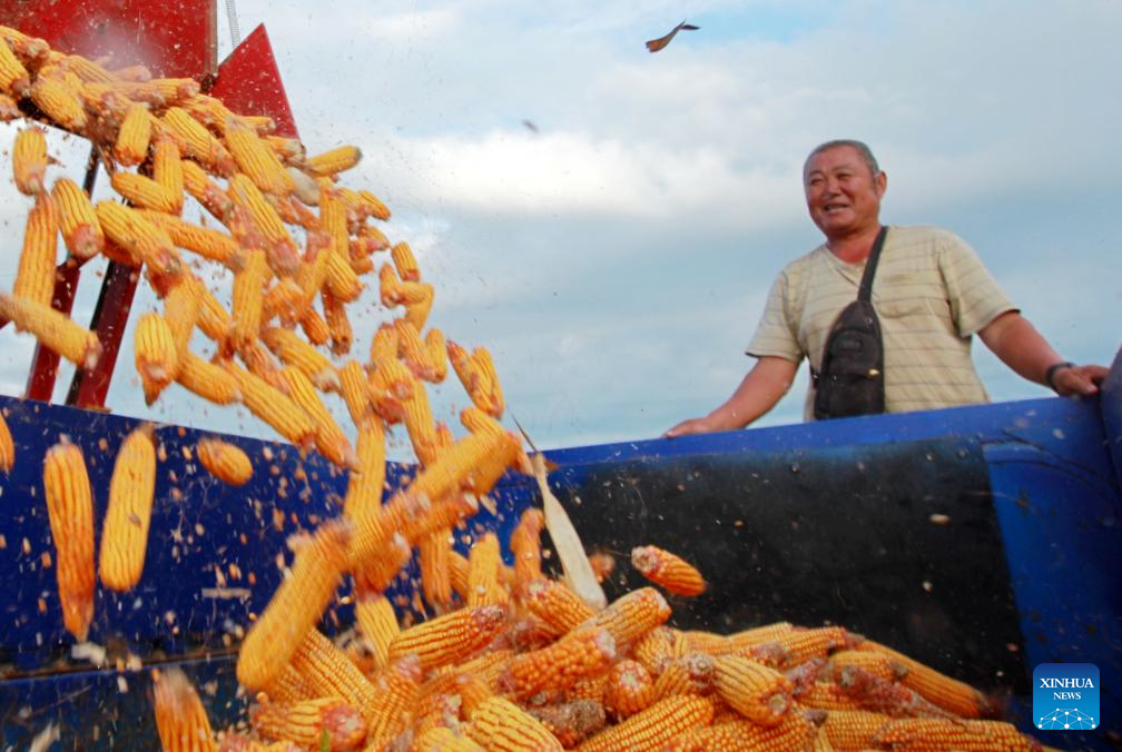 Un agricultor carga maíces cosechados en un camión en el municipio de Bianqiao de la ciudad de Linyi, provincia oriental china de Shandong, el 17 de septiembre de 2024. Este domingo se celebró el séptimo festival de la cosecha de los agricultores chinos. (Foto de Wu Jiquan/Xinhua.)