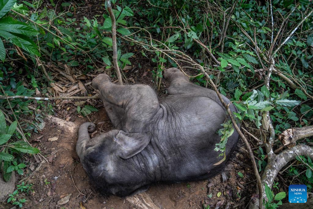 Una cría de elefante descansa en el suelo en la prefectura autónoma de la etnia dai de Xishuangbanna, provincia suroccidental china de Yunnan, el 8 de diciembre de 2024. (Xinhua/Hu Chao.)