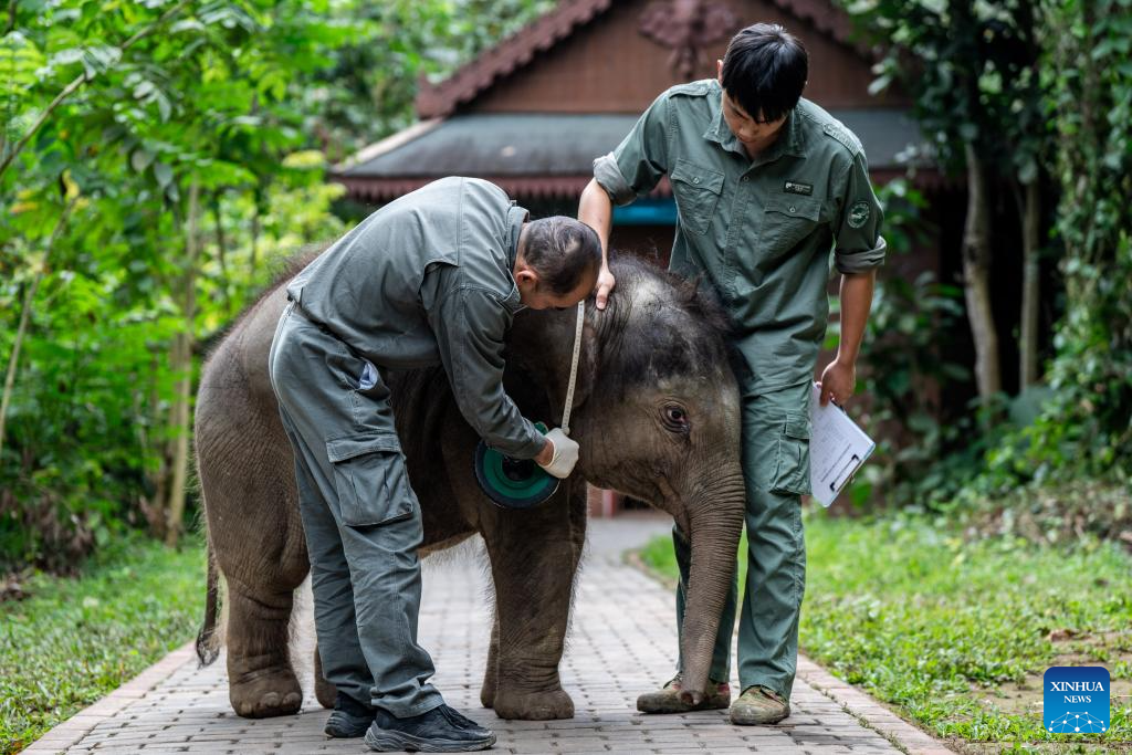 Chen Jiming (izq.) y Mo Shiyu examinan a una cría de elefante en el Centro de Cría y Rescate de Elefantes Asiáticos de Xishuangbanna, en la prefectura autónoma de la etnia dai de Xishuangbanna, provincia suroccidental china de Yunnan, el 8 de diciembre de 2024. (Xinhua/Hu Chao.)