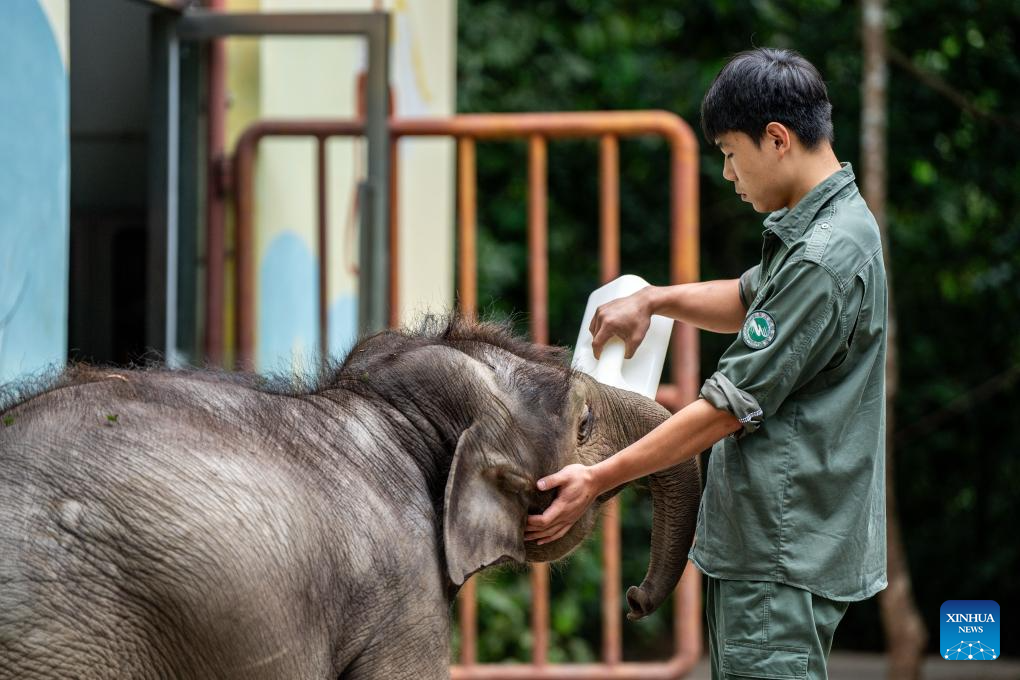 Mo Shiyu cuida a una cría de elefante en el Centro de Cría y Rescate de Elefantes Asiáticos de Xishuangbanna, en la prefectura autónoma de la etnia dai de Xishuangbanna, provincia suroccidental china de Yunnan, el 8 de diciembre de 2024. (Xinhua/Hu Chao.)