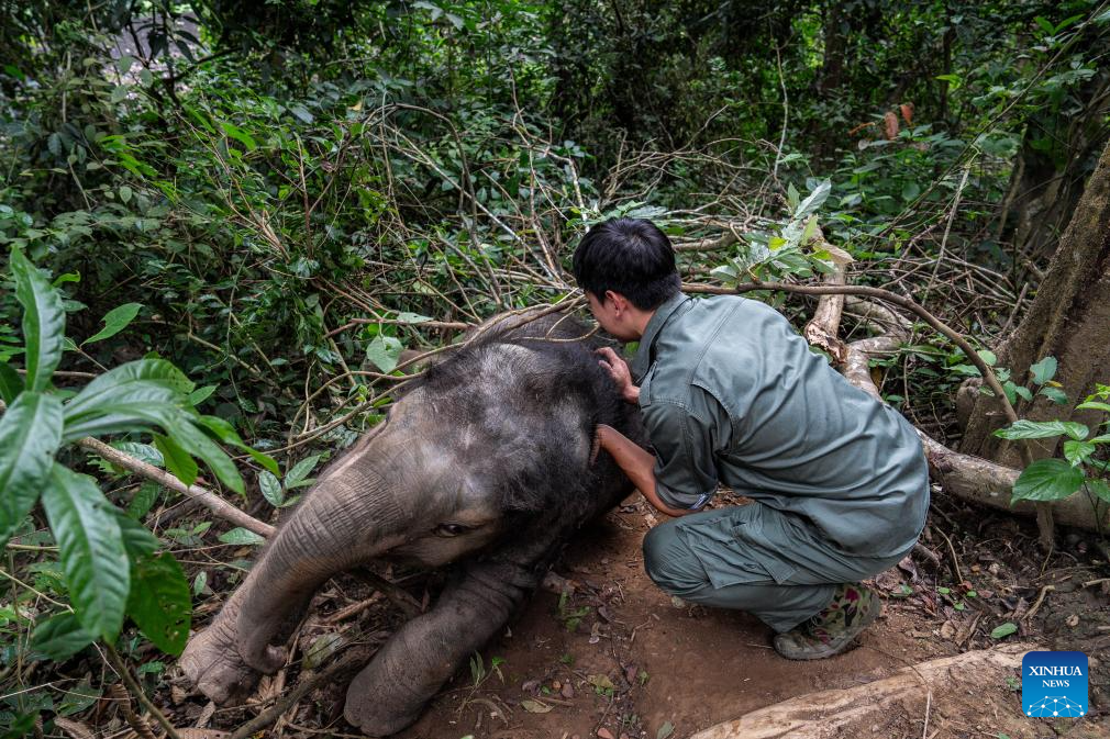 Mo Shiyu ayuda a una cría de elefante a levantarse del suelo en la prefectura autónoma de la etnia dai de Xishuangbanna, provincia suroccidental china de Yunnan, el 8 de diciembre de 2024. (Xinhua/Hu Chao.)