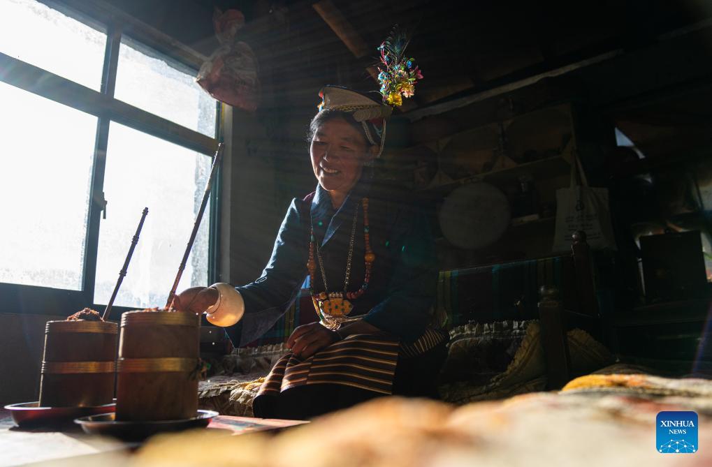 Una mujer sherpa prepara vino local para los invitados en el municipio de Zhentang, distrito de Dinggye de Xigaze, región autónoma de Xizang en el suroeste de China, el 13 de diciembre de 2024. (Xinhua/Tenzin Nyida.)