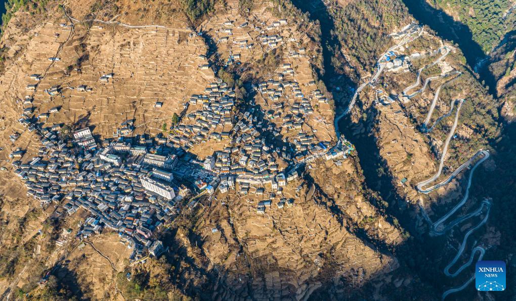 Una foto aérea tomada por un dron el 13 de diciembre de 2024 muestra una vista del municipio de Zhentang, distrito de Dinggye de Xigaze, en la región autónoma de Xizang, suroeste de China. (Xinhua/Tenzin Nyida.)