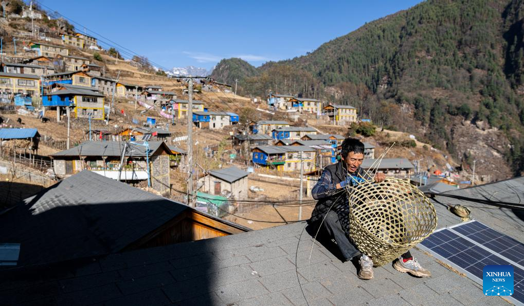 Un hombre sherpa elabora cestas de bambú en un tejado en el municipio de Zhentang, distrito de Dinggye de Xigaze, región autónoma de Xizang en el suroeste de China, el 13 de diciembre de 2024. (Xinhua/Tenzin Nyida.)