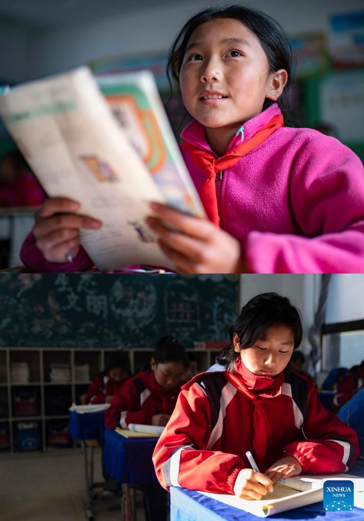 Esta foto combinada muestra a la estudiante sherpa Wangmo leyendo un libro de texto en un aula, el 24 de noviembre de 2021 (arriba, foto del fotógrafo de Xinhua Purbu Zhaxi) , y a Wangmo durante una lección de matemáticas de sexto grado en un aula el 13 de diciembre de 2024 (foto del fotógrafo de Xinhua Tenzin Nyida), en el municipio de Zhentang, distrito de Dinggye de Xigaze, región autónoma de Xizang, suroeste de China. (Xinhua.)