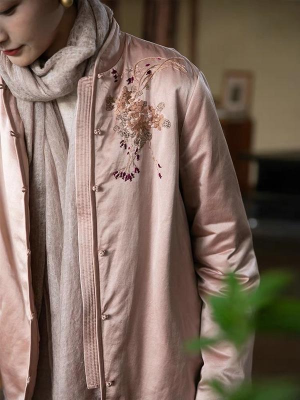 Para los que prefieren colores menos atrevidos, una chaqueta de seda rosa con bordados tradicionales puede ser una buena alternativa al rojo.