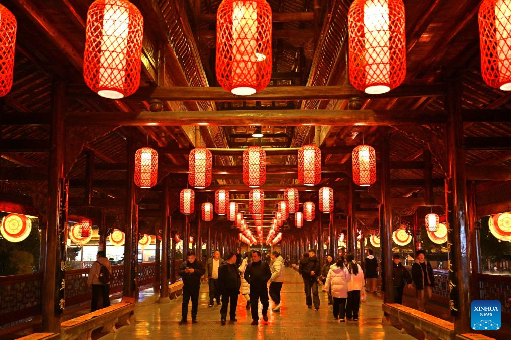 Imagen del 28 de diciembre de 2024 de turistas visitando el puente Fengyu adornado con linternas, en el distrito de Xuan'en, en la provincia de Hubei, en el centro de China. China se está preparando para el próximo Año Nuevo 2025 con decoraciones festivas y diversas actividades en todo el país. (Xinhua/Song Wen)