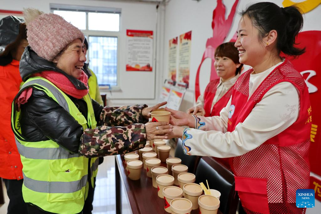 Voluntarios sirven gachas de Laba gratuitos para empleados de saneamiento, en el distrito de Haigang de Qinhuangdao, en la provincia de Hebei, en el norte de China, el 6 de enero de 2025. Diferentes actividades se llevaron a cabo a través del país para recibir el próximo Festival Laba, que se conmemora el 7 de enero este año. (Xinhua/Cao Jianxiong)