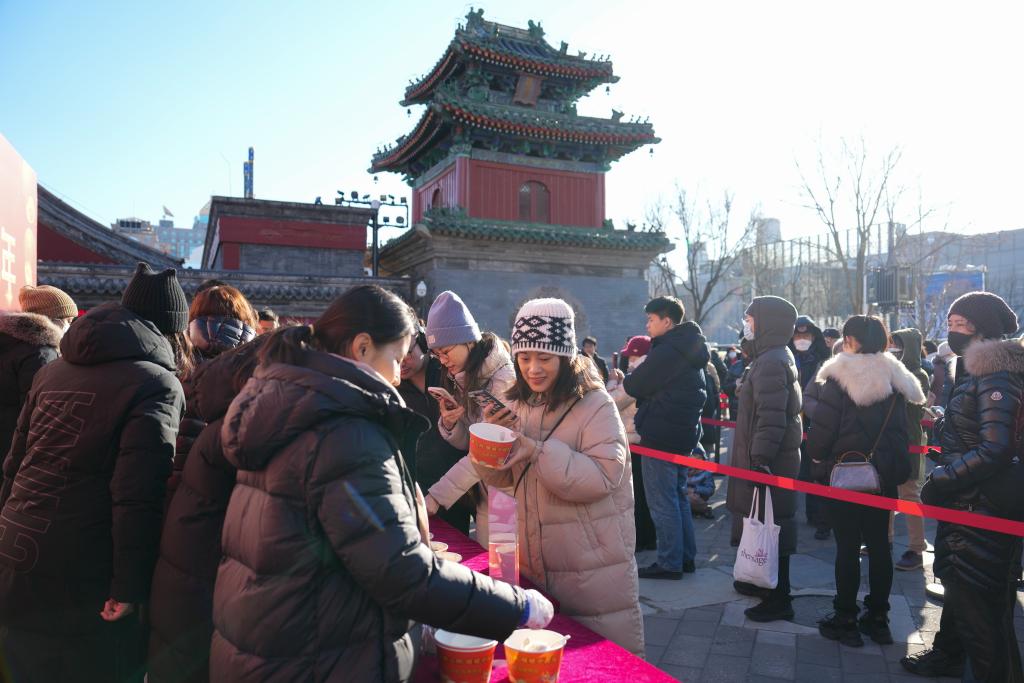 Personas reciben gachas de Laba gratis en un evento cultural celebrado por el Museo de Arte Popular de Beijing, en Beijing, capital de China, el 7 de enero de 2025. El Festival Laba de este año se celebra el martes. (Xinhua/Ju Huanzong)