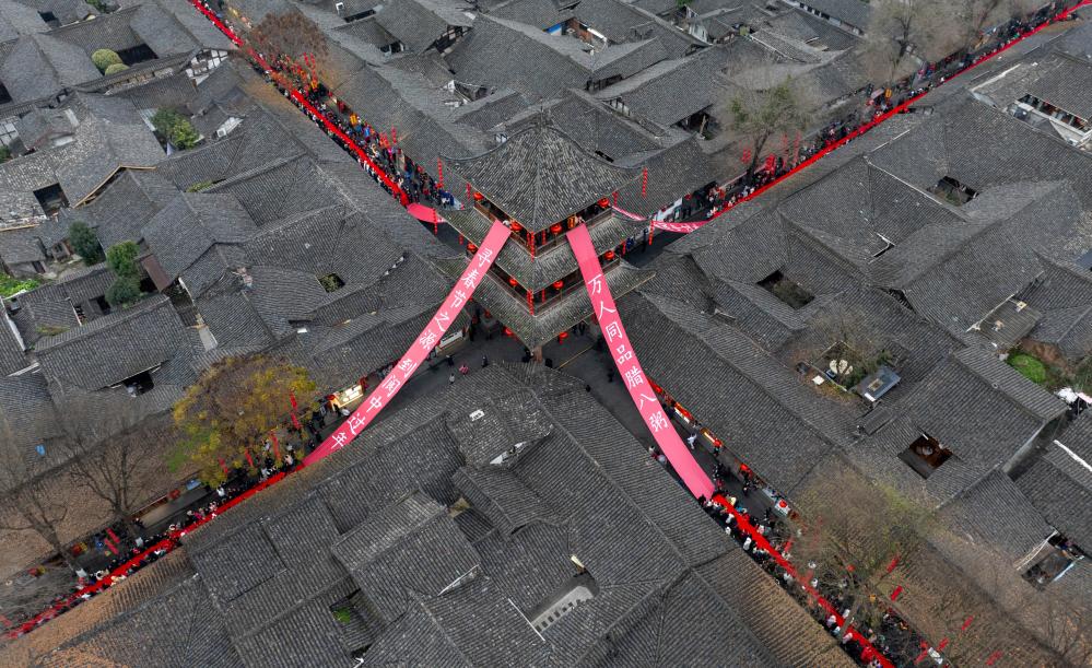 Vista aérea tomada con un dron de un evento de celebración del Festival Laba, en el poblado antiguo de Langzhong, en la provincia de Sichuan, en el suroeste de China, el 7 de enero de 2025. El Festival Laba de este año se celebra el martes. (Xinhua/Jiang Hongjing)