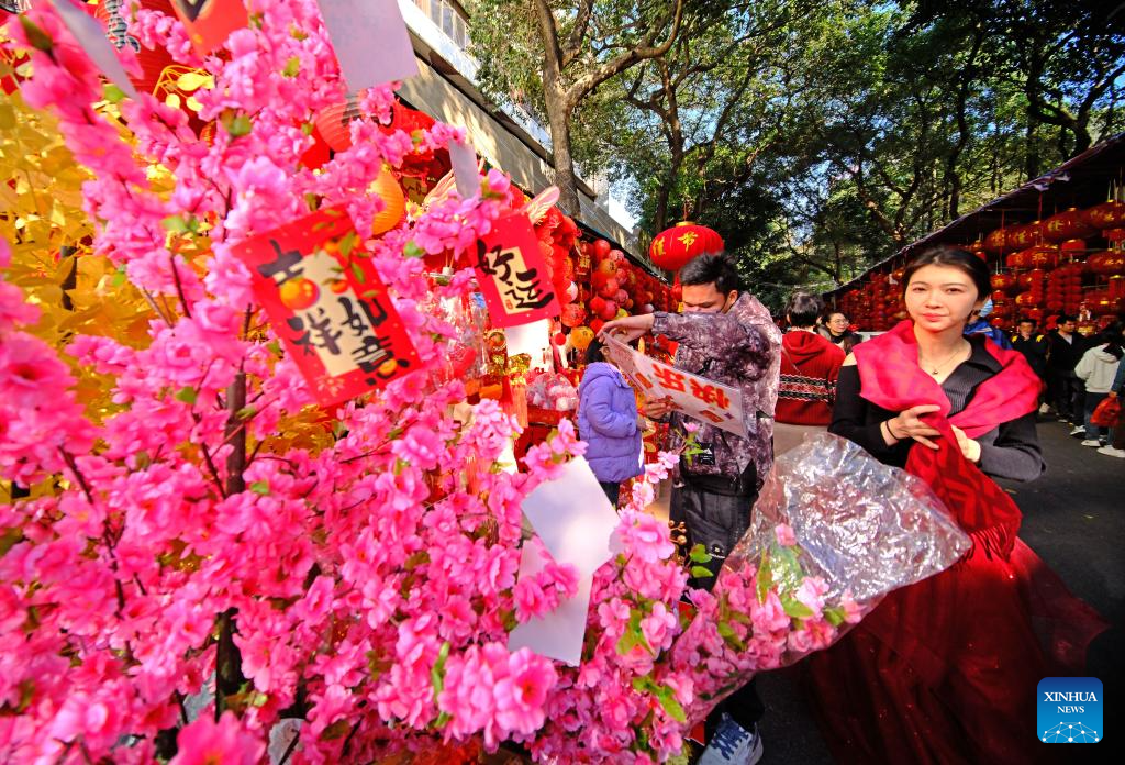 Personas compran decoraciones para el Año Nuevo Lunar chino en una feria local, en Nanning, en la región autónoma zhuang de Guangxi, en el sur de China, en el sur de China, el 12 de enero de 2025. (Xinhua/Zhou Hua)