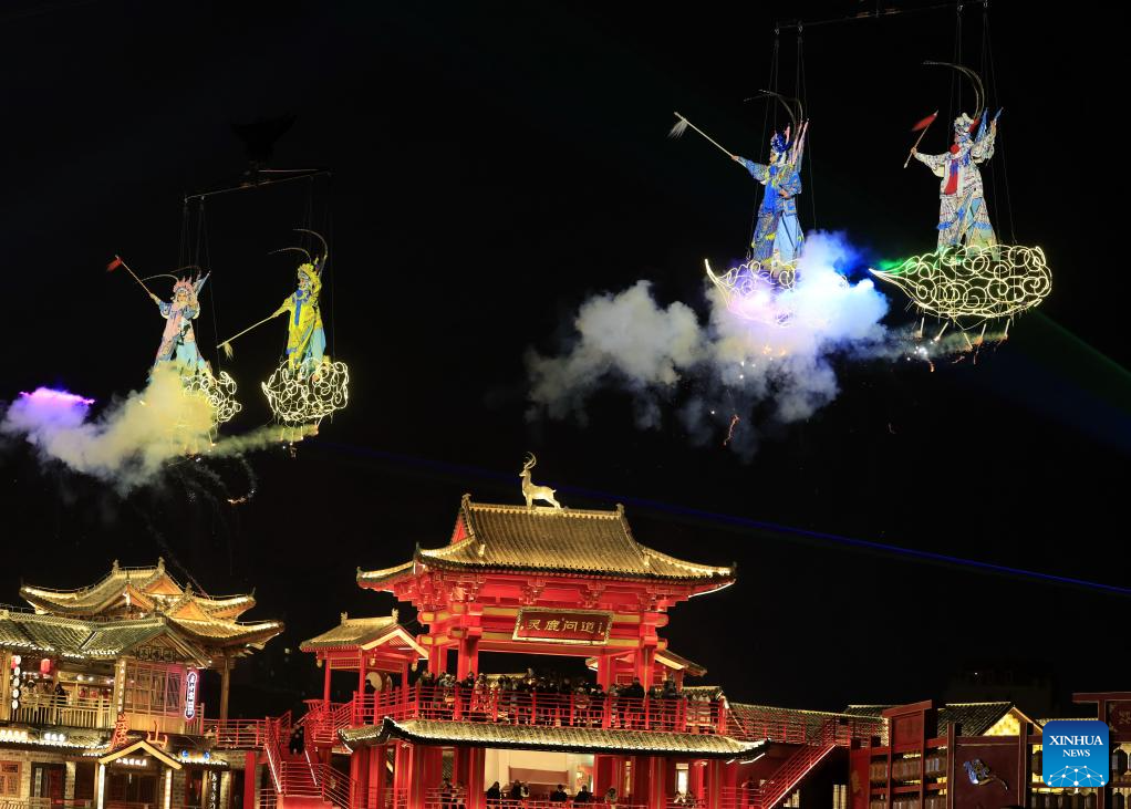 Imagen del 17 de enero de 2025 de actores presentando una obra de ópera tradicional en un área de turismo cultural, en el distrito de Fengnan de la ciudad de Tangshan, en la provincia de Hebei, en el norte de China. Las celebraciones del Festival de Primavera comenzaron recientemente aquí con una serie de actividades que incluyen fuegos artificiales de hierro fundido, desfile de linternas y otras exhibiciones del patrimonio cultural inmaterial y de la cultura popular, y durarán hasta el 27 de febrero. (Xinhua/Yang Shiyao)