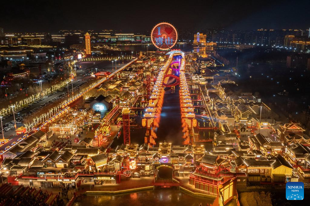 Vista aérea tomada con un dron el 17 de enero de 2025 de las decoraciones festivas en un área de turismo cultural, en el distrito de Fengnan de la ciudad de Tangshan, en la provincia de Hebei, en el norte de China. Las celebraciones del Festival de Primavera comenzaron recientemente aquí con una serie de actividades que incluyen fuegos artificiales de hierro fundido, desfile de linternas y otras exhibiciones del patrimonio cultural inmaterial y de la cultura popular, y durarán hasta el 27 de febrero. (Xinhua/Yang Shiyao)