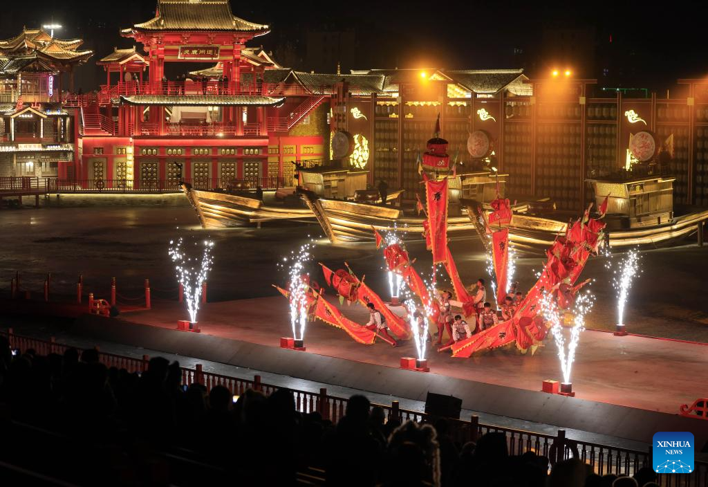 Imagen del 17 de enero de 2025 de actores realizando una presentación en un área de turismo cultural, en el distrito de Fengnan de la ciudad de Tangshan, en la provincia de Hebei, en el norte de China. Las celebraciones del Festival de Primavera comenzaron recientemente aquí con una serie de actividades que incluyen fuegos artificiales de hierro fundido, desfile de linternas y otras exhibiciones del patrimonio cultural inmaterial y de la cultura popular, y durarán hasta el 27 de febrero. (Xinhua/Yang Shiyao)