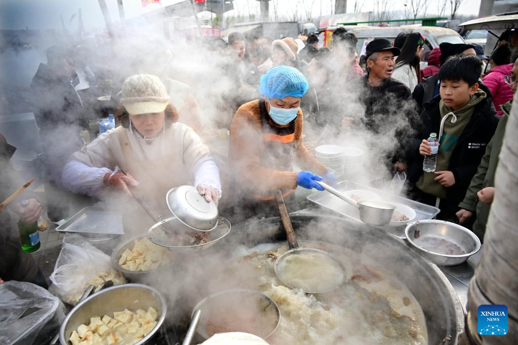 Personas compran exquisiteces locales en el Mercado Poli, en la Nueva Área de Xihai'an (Costa Oeste) de Qingdao, en Qingdao, en la provincia de Shandong, en el este de China, el 18 de enero de 2025. Con una historia de más de 300 años, el Mercado Poli es patrimonio cultural inmaterial local y uno de los mayores mercados tradicionales de la provincia oriental de Shandong. A medida que se acerca el Festival de Primavera, muchos visitantes acuden al mercado en busca de abundantes decoraciones de Año Nuevo, productos agrícolas, delicias locales, etc. (Xinhua/Li Ziheng)