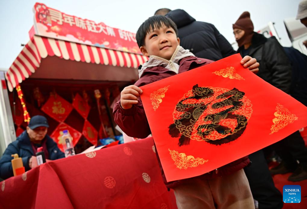 Un niño recibe un trabajo de caligrafía del carácter chino "Fu", que significa "buena fortuna", en el Mercado Poli de la Nueva Área de Qingdao Xihai'an (Costa Oeste), en Qingdao, en la provincia de Shandong, en el este de China, el 18 de enero de 2025. Con una historia de más de 300 años, el Mercado Poli es patrimonio cultural inmaterial local y uno de los mayores mercados tradicionales de la provincia oriental de Shandong. A medida que se acerca el Festival de Primavera, muchos visitantes acuden al mercado en busca de abundantes decoraciones de Año Nuevo, productos agrícolas, delicias locales, etc. (Xinhua/Li Ziheng)