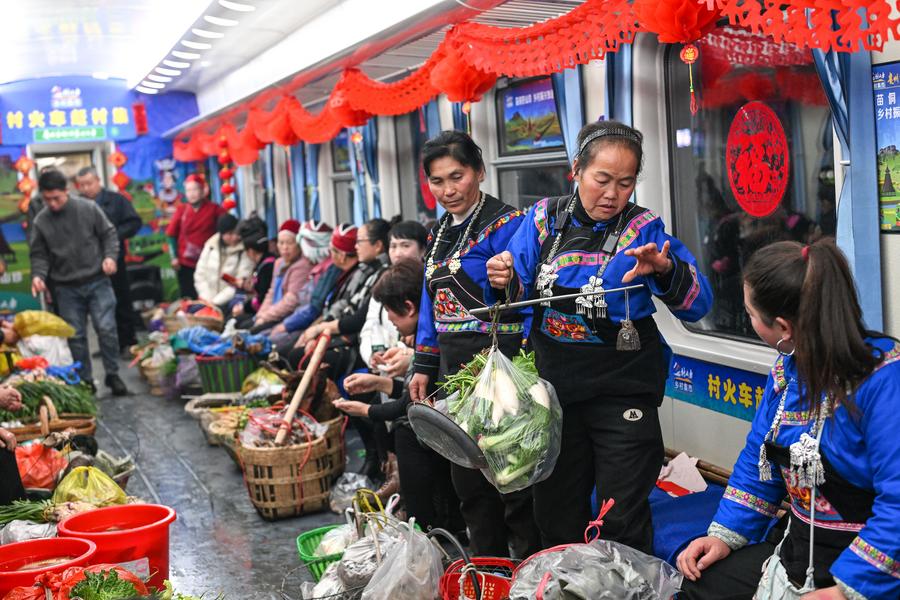Aldeanas venden mercancías en el tren núm. 5640 en la provincia suroccidental china de Guizhou, el 18 de enero de 2025. (Xinhua/Yang Wenbin.)