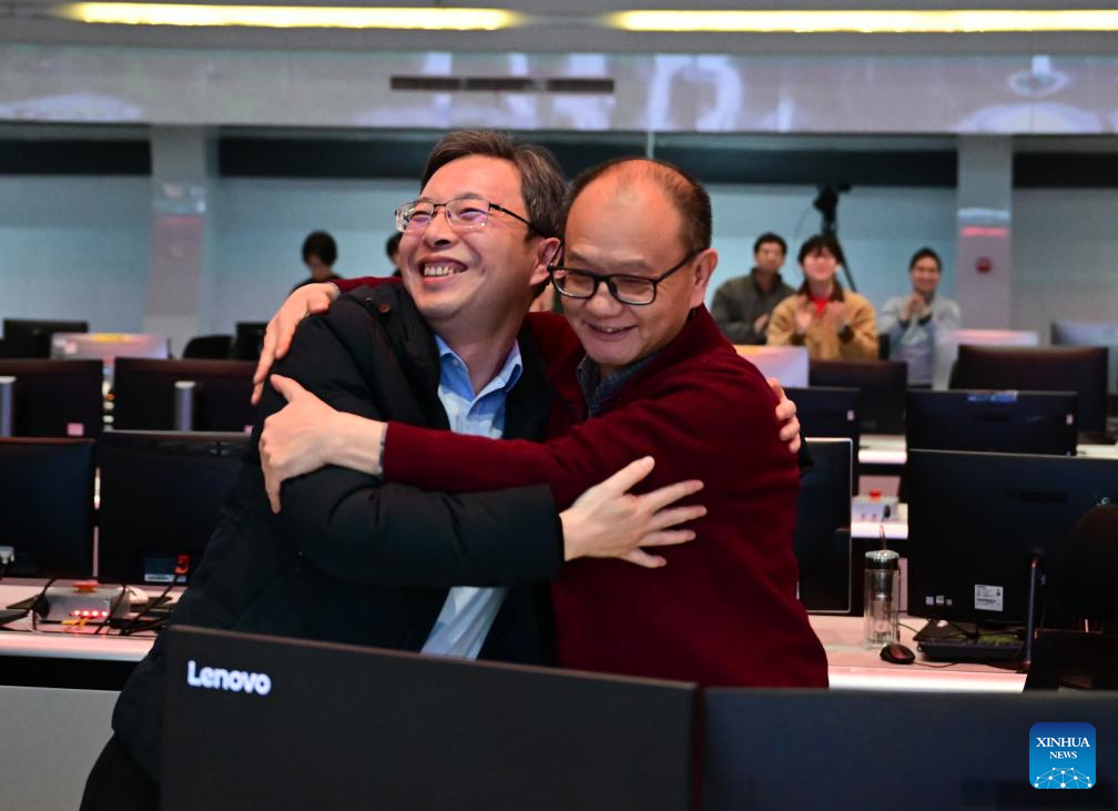 Gong Xianzu (d), jefe de la División de Física y Operaciones Experimentales del Tokamak Superconductor Avanzado Experimental (EAST, siglas en inglés), y Lu Kun, subdirector del Instituto de Física de Plasma de la Academia de Ciencias de China (ASIPP, por sus siglas en inglés), festejan en Hefei, en la provincia de Anhui, en el este de China, el 20 de enero de 2025. El EAST, apodado como "sol artificial" de China, mantuvo el lunes una operación de plasma de alto confinamiento en estado estacionario durante notables 1.066 segundos, estableciendo un nuevo récord mundial y marcando un gran avance en la búsqueda de la generación de energía de fusión. La duración de 1.000 segundos es considerada un paso clave en la investigación de la fusión. El avance, logrado por el ASIPP, mejoró en gran medida el anterior récord mundial de 403 segundos, que también había sido establecido por el EAST en 2023. (Xinhua/Zhou Mu)