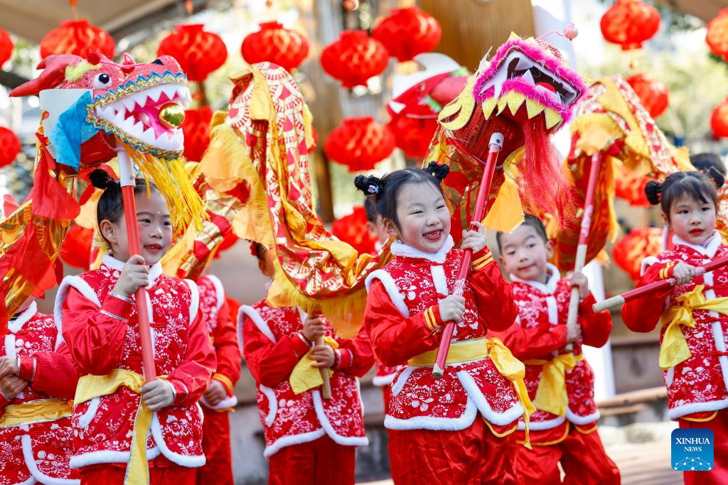 Niños bailan la danza del dragón en un jardín de infancia en la ciudad de Huangshan, provincia oriental china de Anhui, el 17 de enero de 2025. En todo el país se están celebrando diversas actividades para dar la bienvenida al próximo Año Nuevo chino, o Fiesta de la Primavera, que este año cae el 29 de enero. (Foto de Shi Yalei/Xinhua.)
