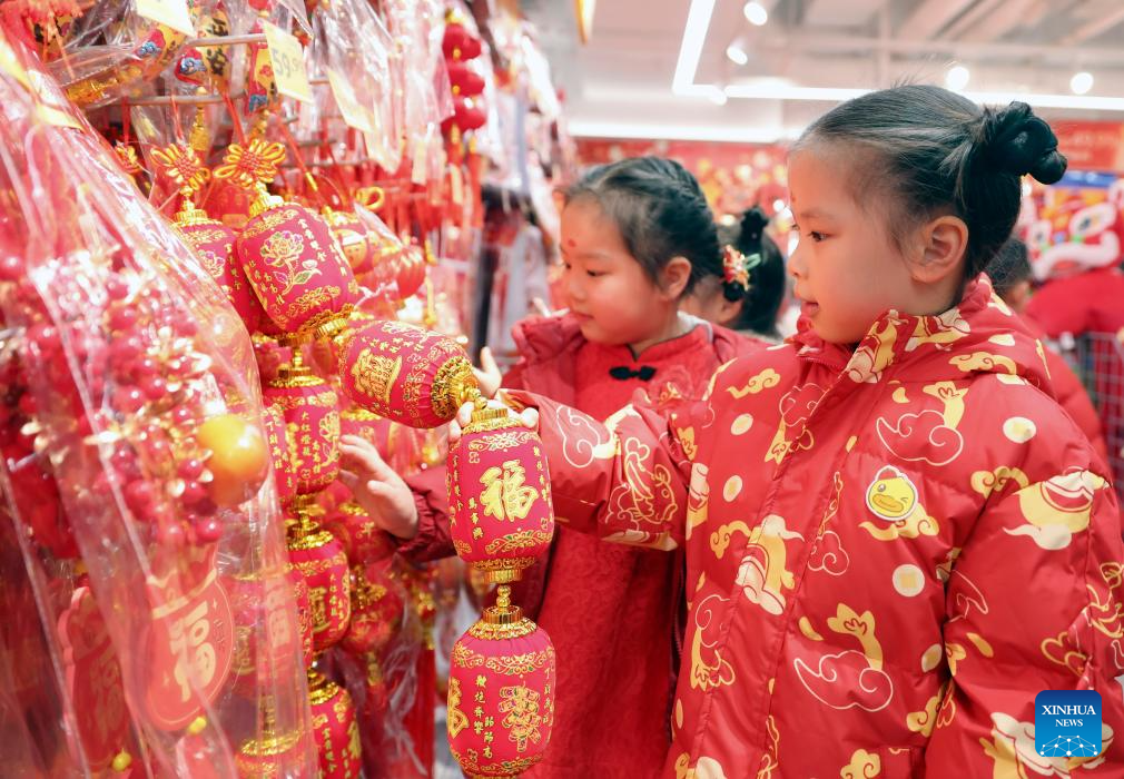 Unas niñas seleccionan adornos para la Fiesta de la Primavera en un supermercado de la ciudad de Wuhan, en la provincia central china de Hubei, el 17 de enero de 2025. En todo el país se están celebrando diversas actividades para dar la bienvenida al próximo Año Nuevo chino, o Fiesta de la Primavera, que este año cae el 29 de enero. (Fotografía de Zhao Jun/Xinhua.)