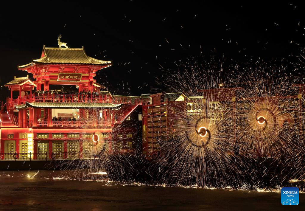 Imagen del 17 de enero de 2025 de un espectáculo de fuegos artificiales de hierro fundido en un área de turismo cultural, en el distrito de Fengnan de la ciudad de Tangshan, en la provincia de Hebei, en el norte de China. Las celebraciones del Festival de Primavera comenzaron recientemente aquí con una serie de actividades que incluyen fuegos artificiales de hierro fundido, desfile de linternas y otras exhibiciones del patrimonio cultural inmaterial y de la cultura popular, y durarán hasta el 27 de febrero. (Xinhua/Yang Shiyao)