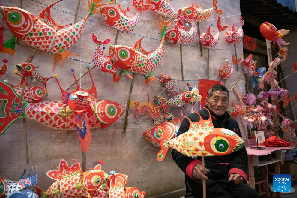 Imagen del 10 de enero de 2025 de un aldeano vendiendo linternas con forma de pez, en la aldea de Zhanqi, en el distrito de Shexian de la ciudad de Huangshan, en la provincia de Anhui, en el este de China. Los aldeanos locales de Shexian tienen la tradición de fabricar linternas con forma de pez, un patrimonio cultural inmaterial, en los días festivos para orar por la cosecha y la buena fortuna. El desfile de linternas con forma de pez es una importante actividad cultural popular que se celebra durante los festivales tradicionales. (Xinhua/Zhang Duan)