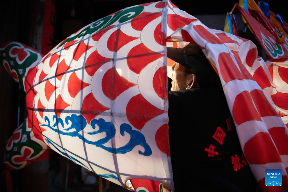 Imagen del 8 de enero de 2025 de un aldeano encendiendo una linterna con forma de pez, en la aldea de Zhanqi, en el distrito de Shexian de la ciudad de Huangshan, en la provincia de Anhui, en el este de China. Los aldeanos locales de Shexian tienen la tradición de fabricar linternas con forma de pez, un patrimonio cultural inmaterial, en los días festivos para orar por la cosecha y la buena fortuna. El desfile de linternas con forma de pez es una importante actividad cultural popular que se celebra durante los festivales tradicionales. (Xinhua/Zhang Duan)