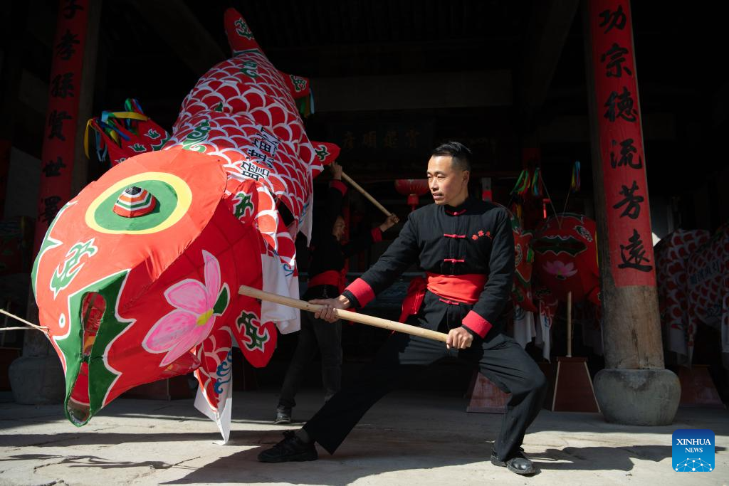 Imagen del 6 de enero de 2025 del capitán de un equipo de interpretación de linternas con forma de pez realizando un baile con linternas con forma de pez, en la aldea de Zhanqi, en el distrito de Shexian de la ciudad de Huangshan, en la provincia de Anhui, en el este de China. Los aldeanos locales de Shexian tienen la tradición de fabricar linternas con forma de pez, un patrimonio cultural inmaterial, en los días festivos para orar por la cosecha y la buena fortuna. El desfile de linternas con forma de pez es una importante actividad cultural popular que se celebra durante los festivales tradicionales. (Xinhua/Zhang Duan)