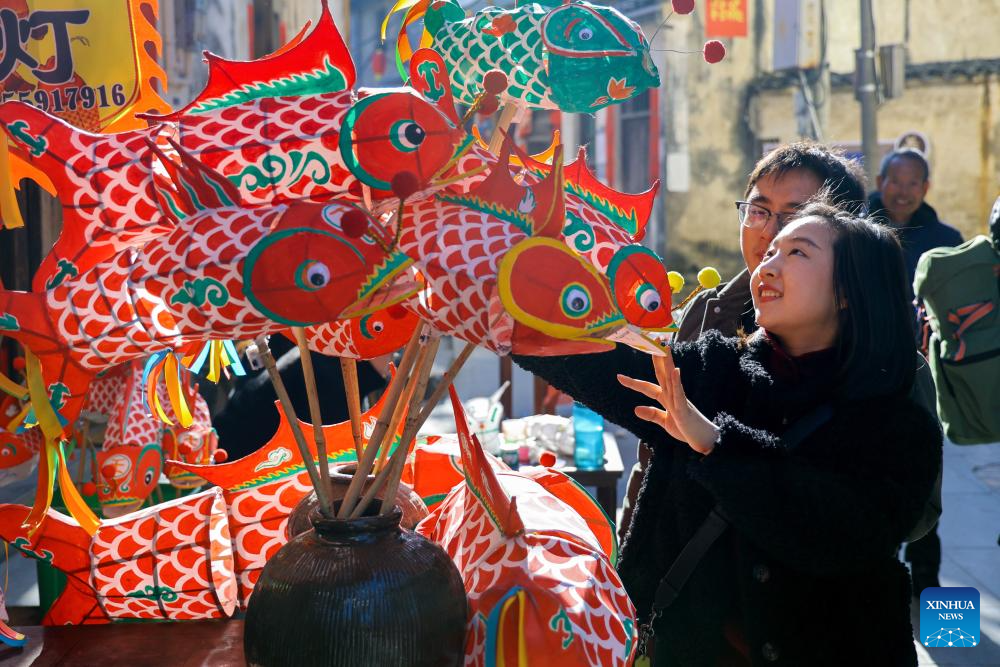 Imagen del 18 de enero de 2025 de turistas seleccionando linternas con forma de pez, en la aldea de Zhanqi, en el distrito de Shexian de la ciudad de Huangshan, en la provincia de Anhui, en el este de China. Los aldeanos locales de Shexian tienen la tradición de fabricar linternas con forma de pez, un patrimonio cultural inmaterial, en los días festivos para orar por la cosecha y la buena fortuna. El desfile de linternas con forma de pez es una importante actividad cultural popular que se celebra durante los festivales tradicionales. (Xinhua/Fan Chengzhu)