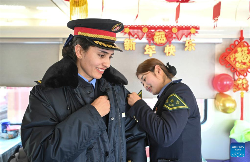 La conductora de tren Airkir Duliki (izq.) se prepara para su turno en el tren que une Kashgar, en la región autónoma uygur de Xinjiang, en el noroeste de China, y Chengdu, en la provincia suroccidental china de Sichuan, el 16 de enero de 2025. Airkir Duliki, la primera conductora de tren de etnia tayika de China, nació y creció en medio de las montañas nevadas y los pastizales en una aldea del distrito autónomo tayiko de Taxkorgan, en la meseta del Pamir. (Xinhua/Hu Huhu.)