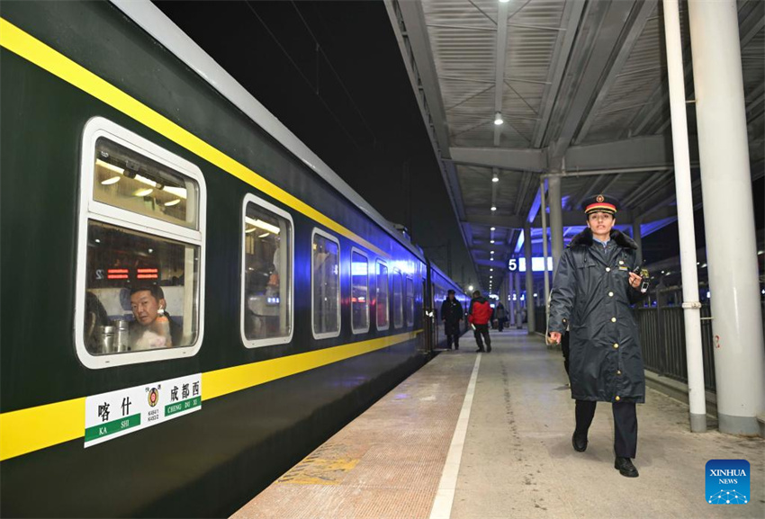 La conductora de tren Airkir Duliki trabaja en un andén de una estación de tren a lo largo de la ruta ferroviaria que une Kashgar, en la región autónoma uygur de Xinjiang, en el noroeste de China, y Chengdu, en la provincia de Sichuan, en el suroeste de China, el 16 de enero de 2025. Airkir Duliki, la primera conductora de tren de etnia tayika de China, nació y creció en medio de las montañas nevadas y los pastizales en una aldea del distrito autónomo tayiko de Taxkorgan, en la meseta del Pamir. (Xinhua/Hu Huhu.)
