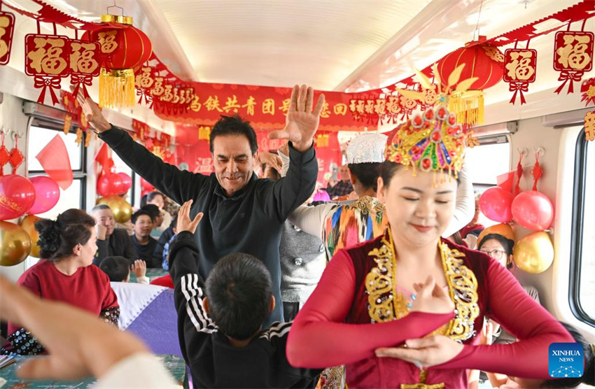 Asistentes de tren y pasajeros asisten a una gala de la Fiesta de la Primavera en el tren que une Kashgar, en la región autónoma uygur de Xinjiang, en el noroeste de China, y Chengdu, en la provincia de Sichuan, en el suroeste de China, el 16 de enero de 2025. Airkir Duliki, la primera conductora de tren de etnia tayika de China, nació y creció en medio de las montañas nevadas y los pastizales en una aldea del distrito autónomo tayiko de Taxkorgan, en la meseta del Pamir. (Xinhua/Hu Huhu.)